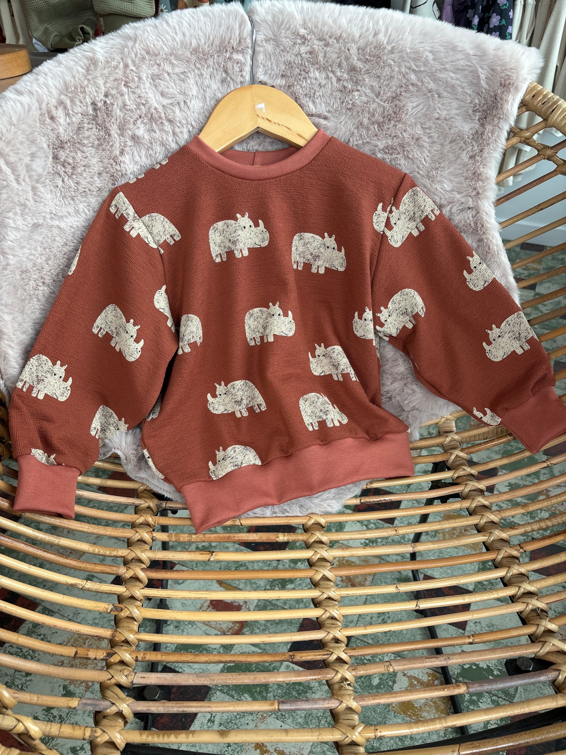 Deze zachte en comfortabele kindertrui brengt meteen een glimlach op je gezicht. De warme roestbruine kleur in combinatie met de speelse all-over print van vrolijke neushoorns maakt dit truitje een echte eyecatcher. Dankzij de ronde hals en de elastische boorden zit hij niet alleen mooi, maar ook heel comfortabel